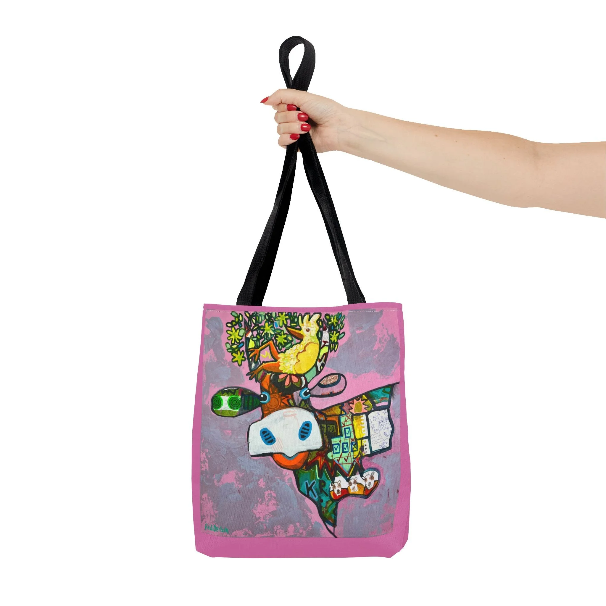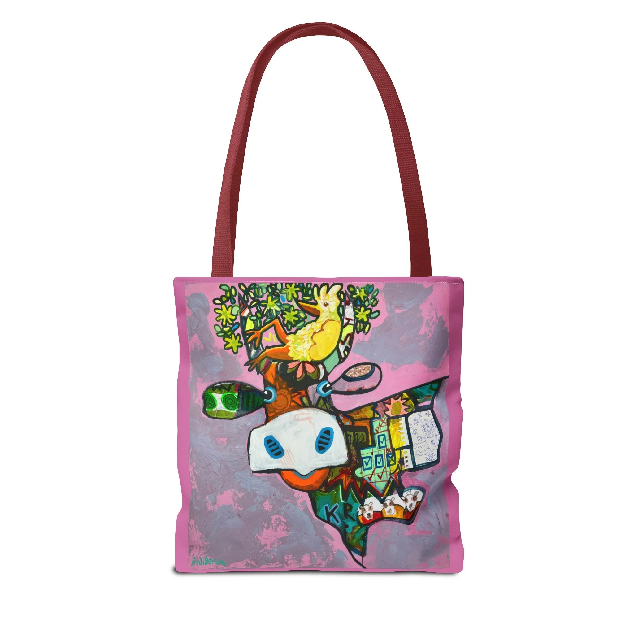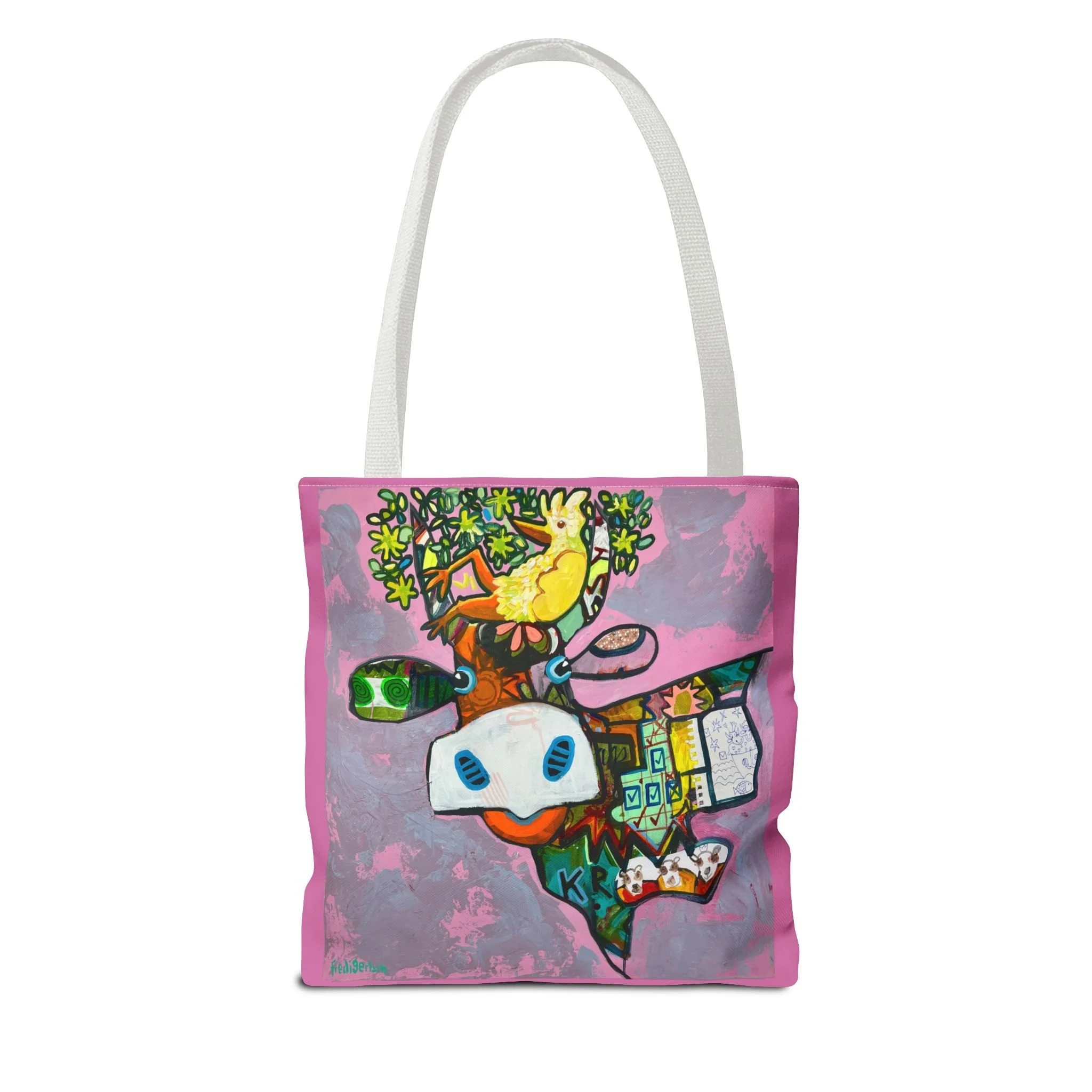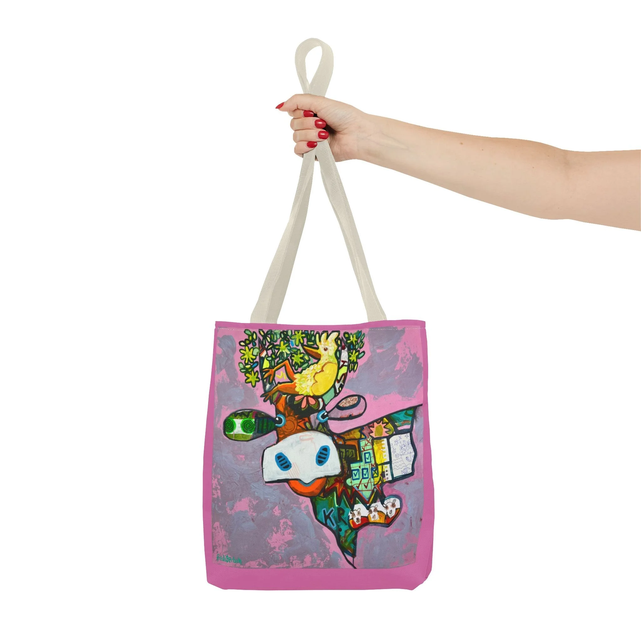 Diese Tragetasche zeigt ein Werk aus der Serie VogelLisi und ist ein praktischer Begleiter für Alltag, Markt, Atelier oder unterwegs. Dank robustem Polyester, verstärkten Tragegriffen und abgenähten Ecken bietet sie viel Platz, trägt zuverlässig und bleibt formstabil.