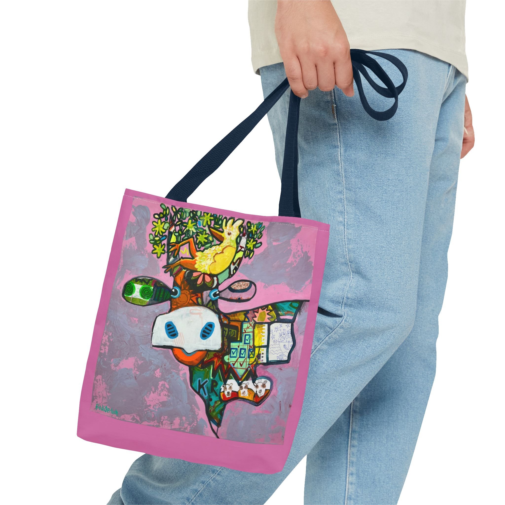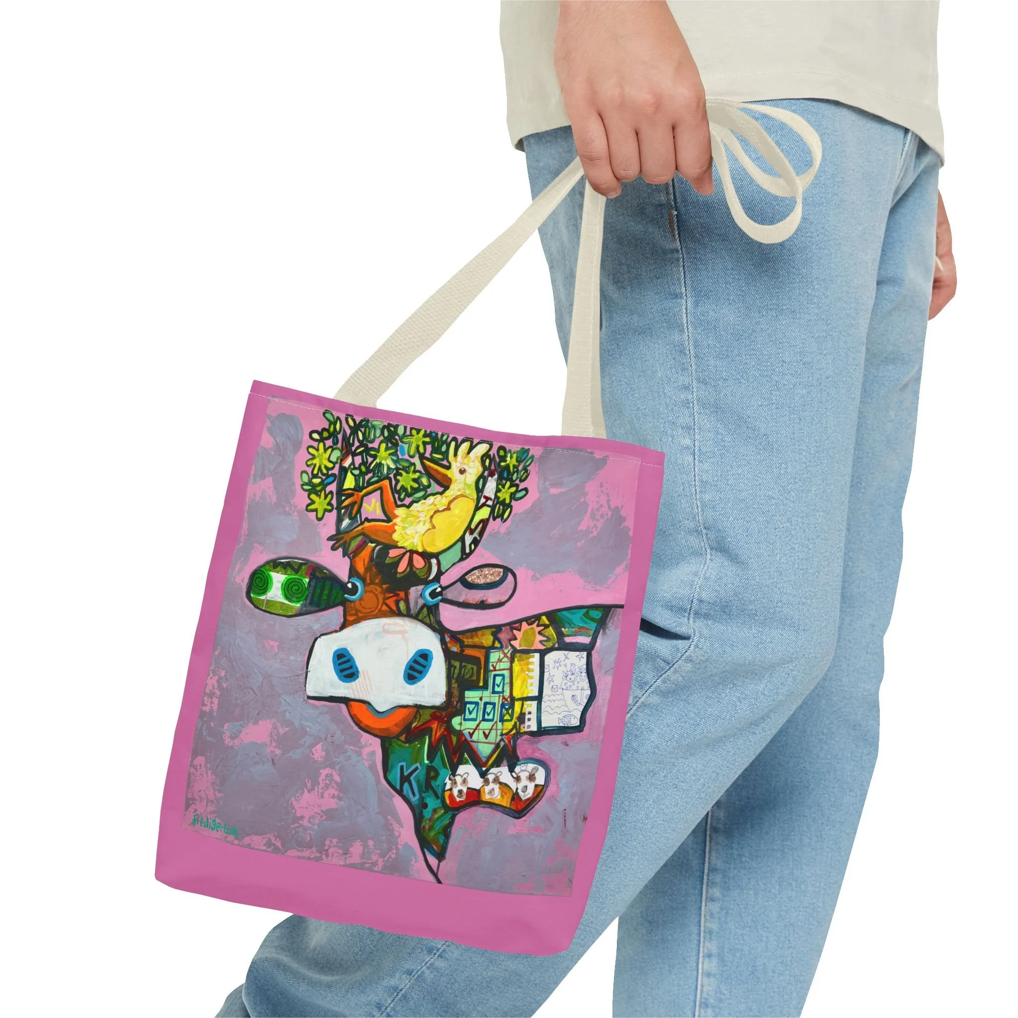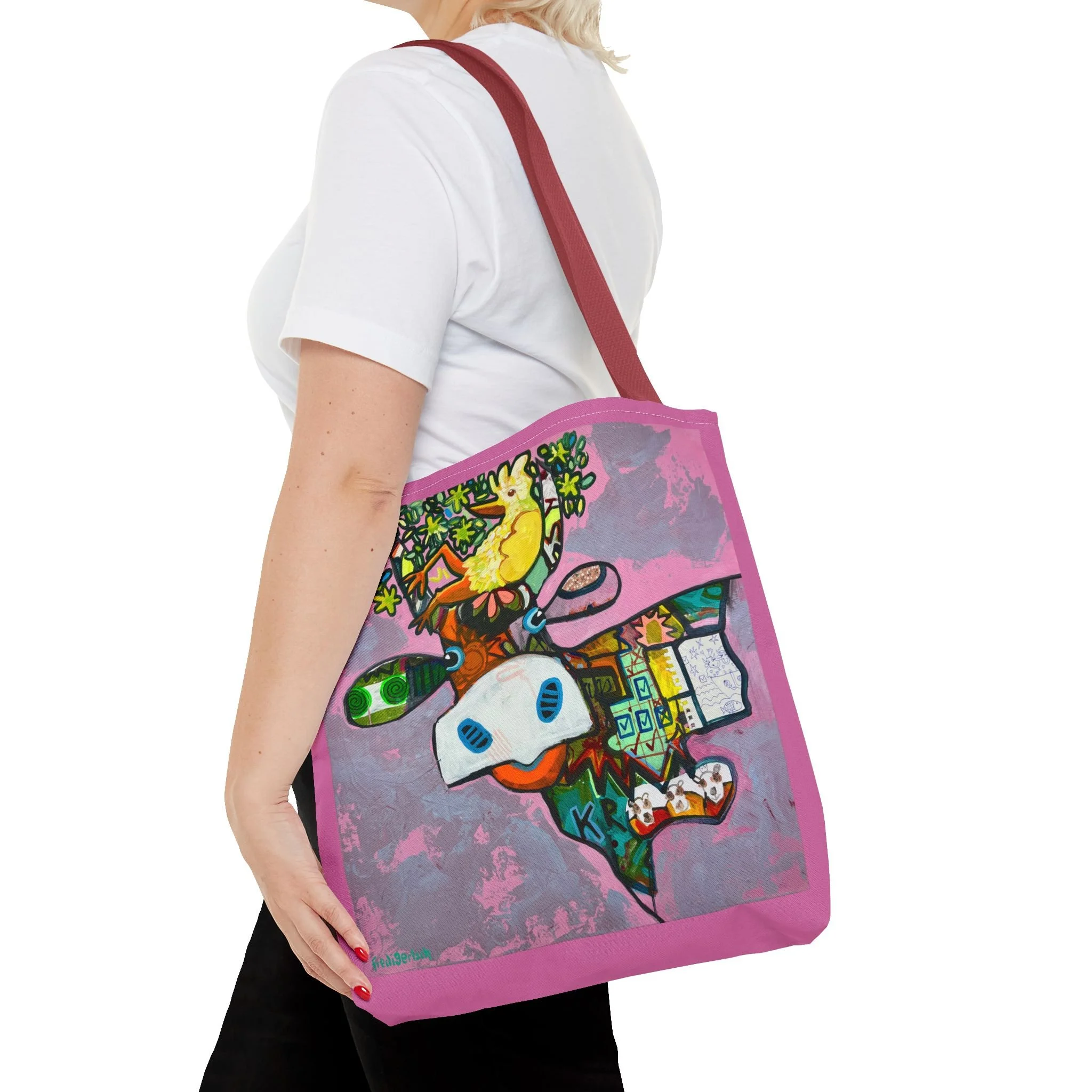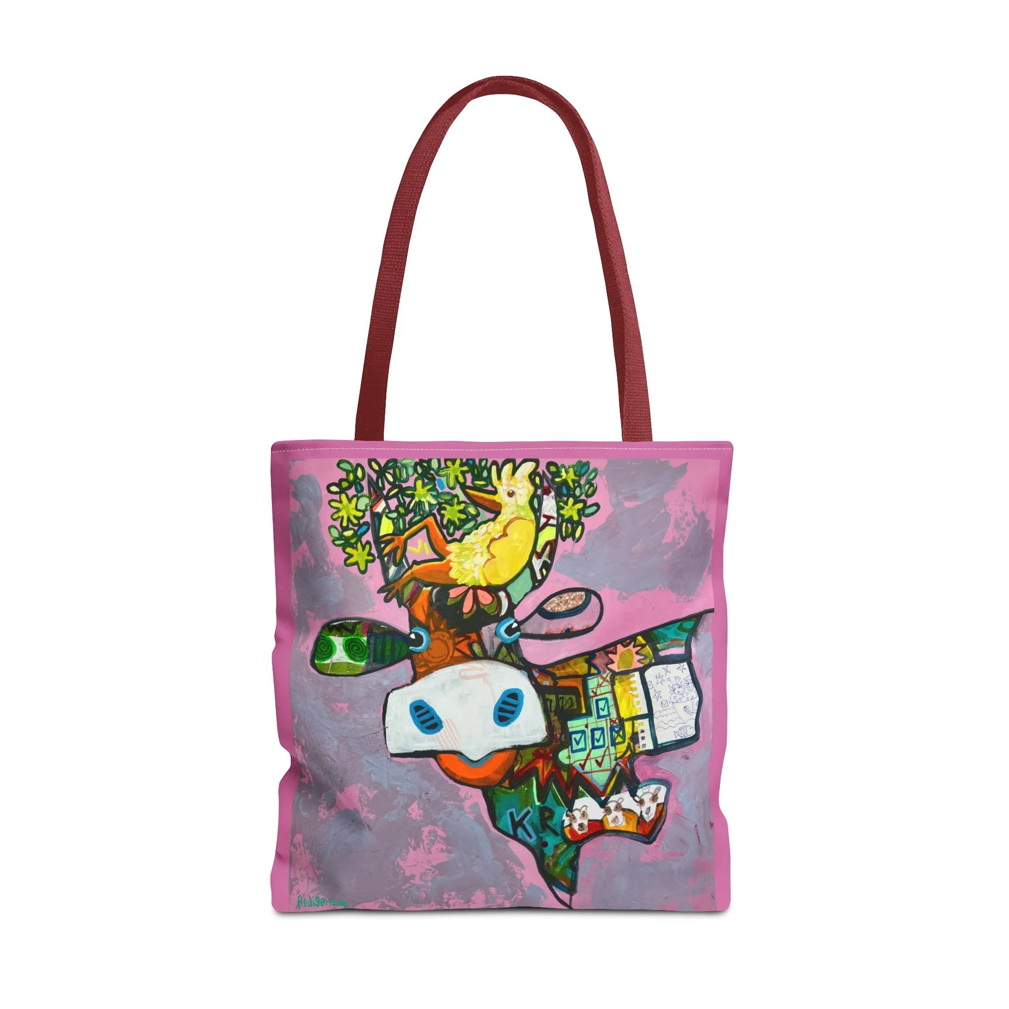 Diese Tragetasche zeigt ein Werk aus der Serie VogelLisi und ist ein praktischer Begleiter für Alltag, Markt, Atelier oder unterwegs. Dank robustem Polyester, verstärkten Tragegriffen und abgenähten Ecken bietet sie viel Platz, trägt zuverlässig und bleibt formstabil.